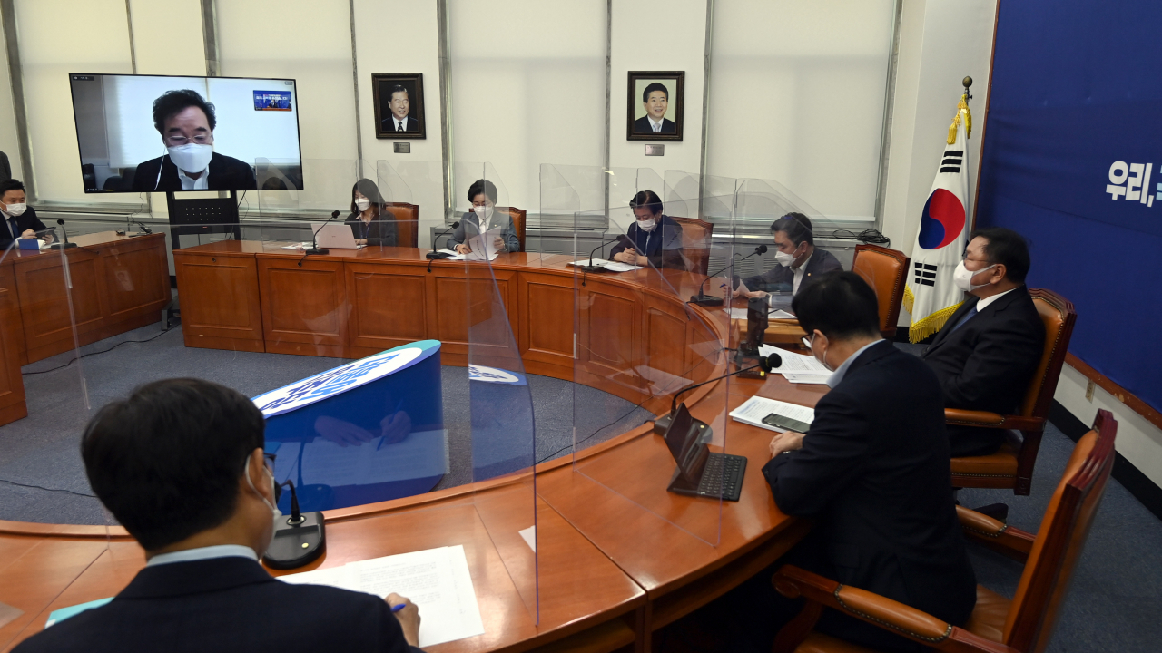 이낙연 더불어민주당 대표가 27일 오전 국회에서 열린 최고위원회의에서 화상으로 참석해 발언하고 있다. 이상섭 기자 babtong@heraldcorp.com |