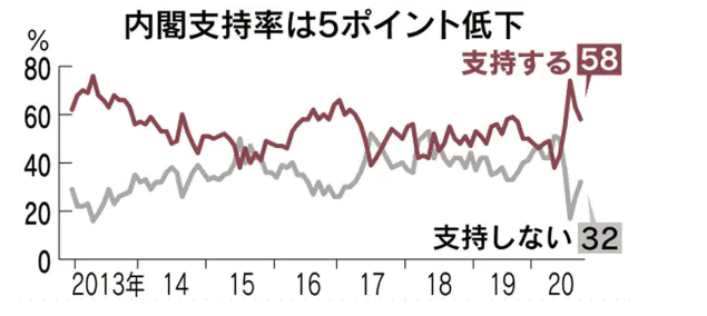 출범한 지 100일도 되지 않은 스가 내각은 코로나19 대응이 미흡하다는 지적을 받으며 지지율이 하락했다. 닛케이와 TV도쿄가 27~29일 전국의 18세 이상 유권자 993명을 대상으로 진행한 여론조사 결과 스가 내각의 지지율은 지난달 조사보다 5%포인트 떨어진 58%를 기록했다. 반면 스가 내각을 지지하지 않는다고 답한 비율은 32%로 6%포인트 올랐다.
