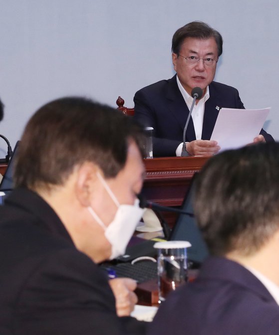 문재인 대통령이 지난 6월 22일 오후 청와대에서 열린 제6차 공정사회 반부패정책협의회에서 윤석열 검찰총장을 쳐다보며 발언하고 있다.[연합뉴스] |