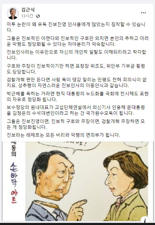 김 교수는 30일 자신의 페이스북을 통해 해당 만평과 관련된 기사를 공유하며 “그들은 진보적인 아젠다와 진보적인 구호만 외치면 본인의 추하고 더러운 악행도 정당화될 수 있다는 자아분리가 익숙하다”고 비판했다.
