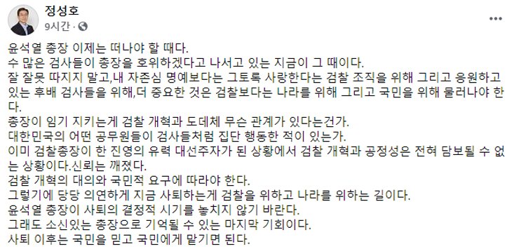 마지막으로 정 의원은 “소신 있는 총장으로 기억될 수 있는 마지막 기회”라며 “사퇴 이후는 국민을 믿고 국민에게 맡기면 된다”며 글을 맺었다.