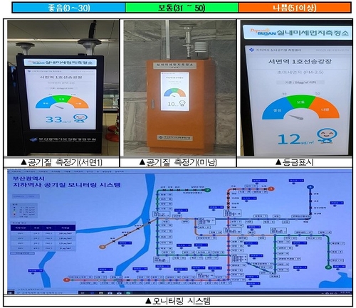 (부산=연합뉴스) 김재홍 기자 = 부산시는 최근 도시철도 1∼4호선 승강장 91곳과 환승역 대합실 13곳 등 104곳에 공기질 자동측정기를 설치했다고 1일 밝혔다.