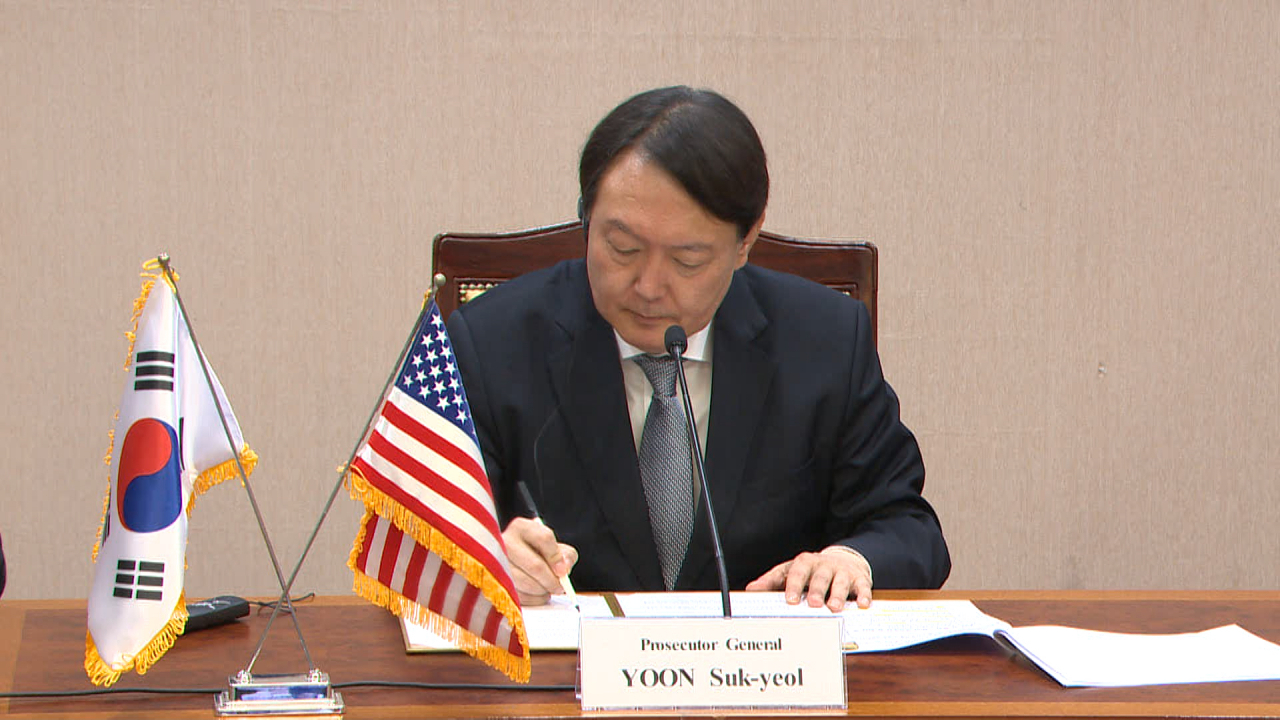 윤석열 검찰총장이 지난달 8일 미국 연방검찰(DOJ)과 화상회의를 통해 진행된 '한미 검찰 반독점 형사집행 MOU 체결식'에서 협약서에 서명하고 있다. [대검찰청 제공] |
