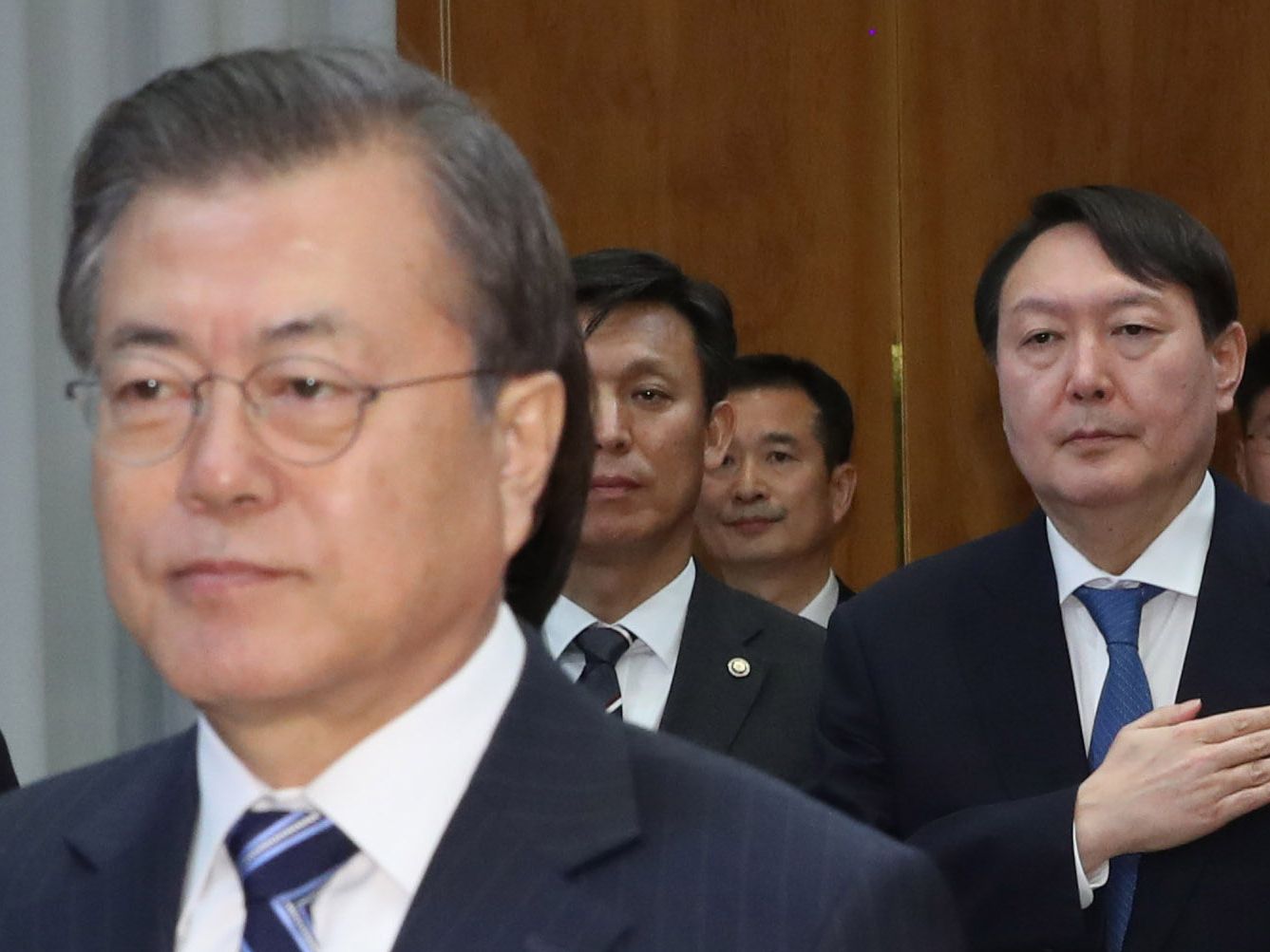 문재인 대통령이 작년 11월 8일 청와대에서 열린 반부패정책협의회에서 국기에 대한 경례를 하고 있다. /연합뉴스 |