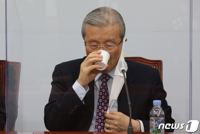 김종인 국민의힘 비상대책위원장이 지난 2일 오전 서울 여의도 국회에서 열린 비상대책위원-중진의원 연석회의에서 목을 축이고 있다. /사진=뉴스1. |