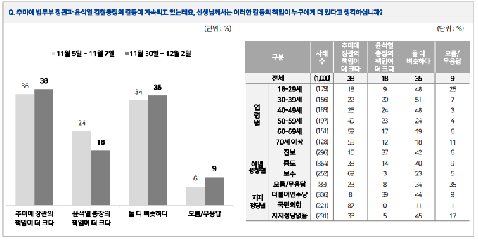엠브레인퍼블릭·케이스탯리서치·코리아리서치·한국리서치 등 여론조사 전문회사 4개사가 지난달 30일부터 2일까지 전국 만 18세 이상 남녀 1004명을 대상으로 조사해 3일 발표한 추 장관과 윤 총장의 갈등 책임에 대한 여론조사 결과에 따르면, '추 장관의 책임이 더 크다'는 응답이 38%로 나타났다.