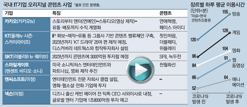 코로나19로 언택트(비대면) 소비가 확산되면서 영상 콘텐츠 수요가 폭발하자 국내 IT(정보기술)기업 간 오리지널 콘텐츠 경쟁에 불이 붙었다. 오리지널 콘텐츠를 내세운 넷플릭스의 한국 공습도 한몫했다. IT 업계에서 오리지널 콘텐츠에 가장 먼저 뛰어든 쪽은 통신사다. 통신망만 깔아 놓고 가입자를 모집해 요금을 받아 수익을 내는 모델이 한계에 부딪쳤기 때문이다.