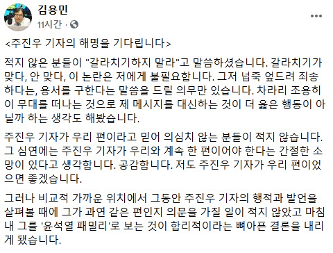 김 이사장은 “주진우 기자가 우리 편이라고 믿어 의심치 않는 분들이 적지 않다. 그 심연에는 주진우 기자가 우리와 계속 한 편이어야 한다는 간절한 소망이 있다고 생각한다. 공감한다”면서도 “비교적 가까운 위치에서 그동안 주진우 기자의 행적과 발언을 살펴볼 때에 그가 과연 같은 편인지 의문을 가질 일이 적지 않았고 마침내 그를 ‘윤석열 패밀리’로 보는 것이 합리적이라는 뼈아픈 결론을 내리게 됐다”고 적었다.