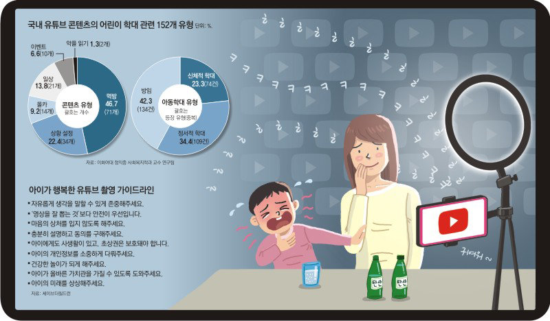 하지만 이런 문제의식은 소셜미디어 세계에선 그리 통용되지 않는다. 이화여대의 정익중 사회복지학과 교수 연구팀이 최근 유튜브의 국내 키즈 콘텐츠 채널 40개가 올린 영상 4690개를 분석했더니, 평균적으로 100건당 3, 4건에서 아동학대가 의심되는 상황이 담겨 있었다. 정 교수는 “해당 아동 및 시청자 어린이들의 피해를 고려하면 결코 낮은 수치가 아니다”고 설명했다.