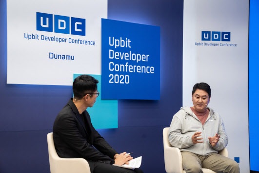 이석우(오른쪽) 두나무 대표가 지난달 30일 막을 올린 `업비트 개발자 컨퍼런스(UDC) 2020`에서 오프닝 토크를 통해 블록체인의 미래에 대해 설명하고 있다.(사진=두나무 제공) |
