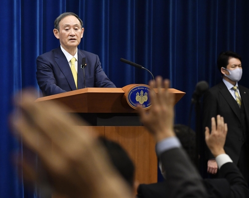 (도쿄 교도=연합뉴스) 스가 요시히데(菅義偉) 일본 총리가 4일 오후 일본 총리관저에서 기자회견을 하고 있다. |