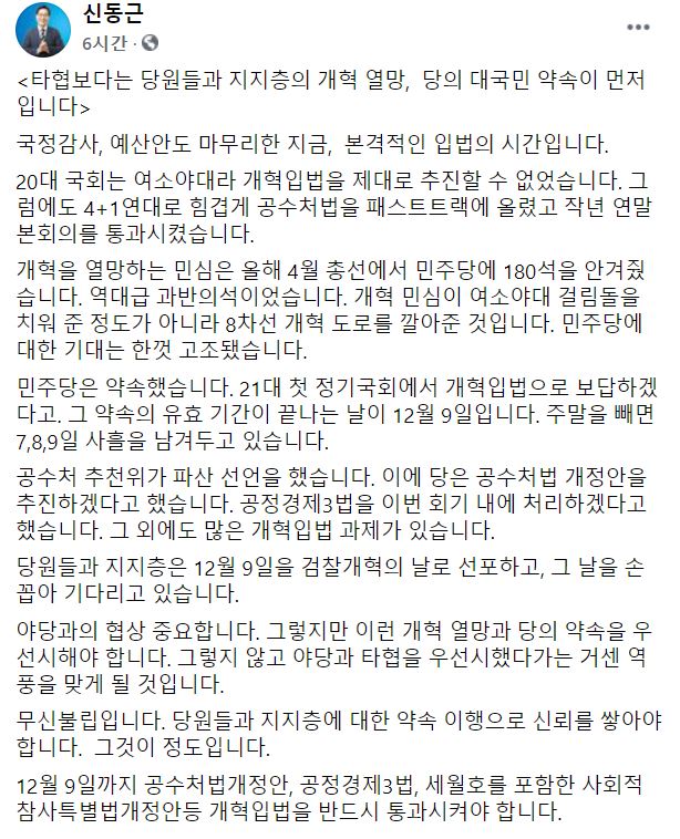 그는 "개혁을 열망하는 민심은 올해 4월 총선에서 민주당에 180석을 안겨줬다. 역대급 과반의석이었다"며 "야당과의 협상이 중요하지만, 개혁에 대한 열망과 당의 약속을 우선시해야 한다. 그렇지 않고 야당과 타협을 우선시했다가는 거센 역풍을 맞게 될 것"이라고 말했다.