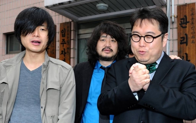 2012년 주진우 기자(왼쪽), 방송인 김어준, 김용민 평화나무 이사장(오른쪽)이 함께 있다. 뉴스1 |