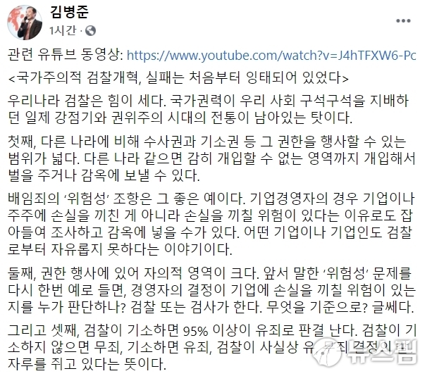 그는 이어 "검경수사권 조정도 그렇다. 틀렸다는 것도, 하지 말라는 것도 아니다. 하지만 검찰과 경찰의 권한 영역이 이렇게 넓고, 또 그 자의적 행사의 가능성이 그대로인 상태에서 뭐가 그리 달라지겠는가"라고 꼬집었다.