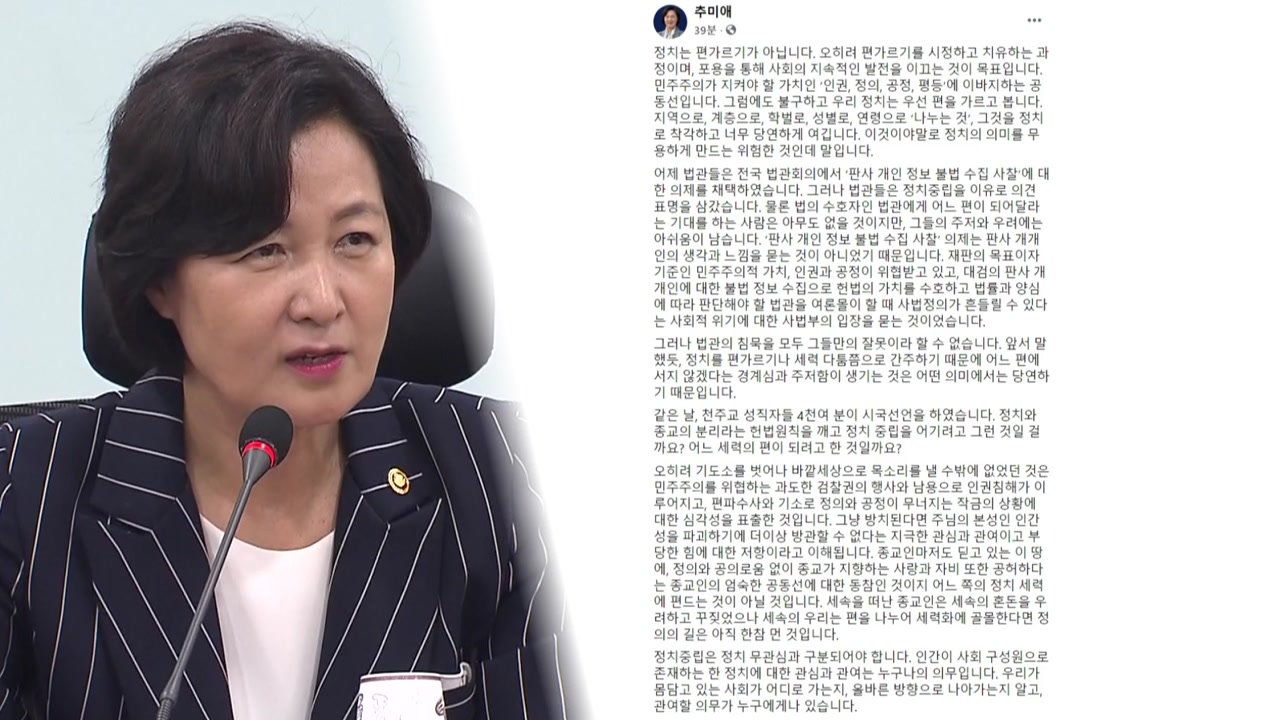 추 장관은 오늘 자신의 SNS에 법관에게 어느 편이 되어달라는 기대를 하는 사람은 아무도 없을 거지만, 그들의 주저와 우려에는 아쉬움이 남는다고 밝혔습니다.