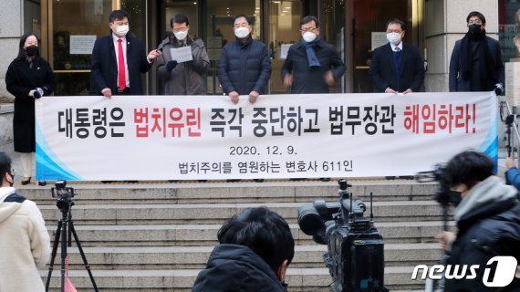 한반도 인권과 통일을 위한 변호사모임 회원들이 9일 오전 서울 서초구 서울지방변호사회관 앞에서 추미애 법무부 장관 해임 등을 촉구하며 전국 변호사 611명이 서명한 연서명문을 발표하고 있다. /사진=뉴스1 |