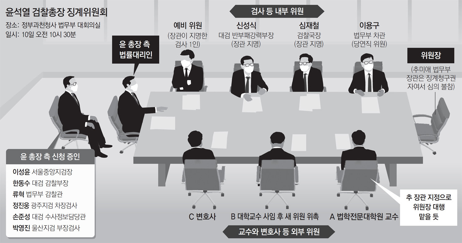 10일 법무부 과천청사에서 열리는 징계위에는 윤 총장 측 법률대리인인 이완규 이석웅 손경식 변호사가 나와 추미애 법무부 장관의 징계 청구가 부당하다고 피력할 예정이다. 윤 총장 측은 징계위 시작과 함께 이용구 법무부 차관과 심재철 법무부 검찰국장 등 일부 위원에 대해 기피 신청을 하기로 했다. 징계위를 앞두고 외부 징계위원 중 한 명인 B 교수가 이달 초 사임하는 등 일부 징계위원이 신중한 태도를 보여 당일 결론이 나지 않을 것이라는 전망도 나온다.