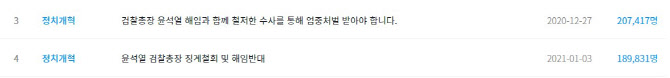 공교롭게도 이 청원 바로 다음으로 참여인원이 적은 청원은 ‘윤석열 검찰총장 징계 철회 및 해임 반대’ 내용이다.