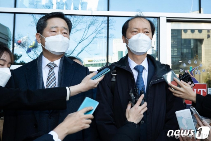 (서울=뉴스1) 유승관 기자 = 윤석열 검찰총장 측 대리인 이완규(오른쪽), 이석웅 변호사가 30일 서울 서초구 서울행정법원에서 열린 법무부의 윤 총장에 대한 직무집행정지 처분에 대한 효력 집행정지 심문기일을 마친 후 나와 취재진 질문에 답하고 있다. 서울행정법원 행정4부(부장판사 조미연)는 이날 윤 총장이 추미애 법무부 장관을 상대로 낸 집무집행정지 처분에 대한 집행정지 사건의 심문기일을 연다. 법원이 집행정지 신청을 받아들이면 1심 본안 판결까지 직무집행정지 처분효력은 정지되고, 윤 총장은 직무를 계속해서 수행할 수 있다. 반대로 기각 결정이 나오면 윤 총장은 남은 임기 직무수행이 불가능해진다. 2020.11.30/뉴스1 |
