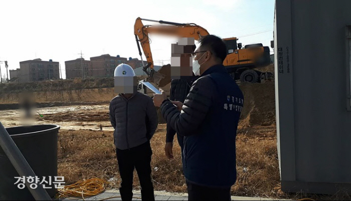 경기도 특별사법경찰단이 공사현장에서 미세먼지 배출 단속 활동을 벌이고 있다. 경기도 제공 |