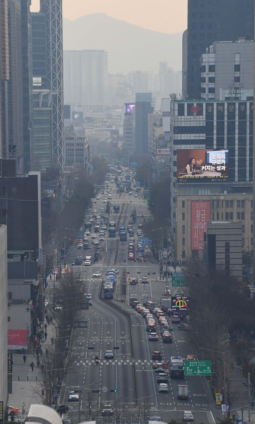 서울을 비롯한 수도권 지역의 초미세먼지 농도가 ‘나쁨’을 보인 10일 서울 종로거리 일대가 뿌옇게 보이고 있다.