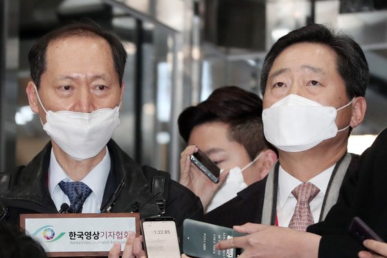 10일 오후 경기도 과천시 정부과천청사 법무부 청사에서 윤석열 검찰총장 측 법률대리인 이완규(왼쪽), 이석웅 변호사가 윤석열 검찰총장에 대한 검사징계위원회를 마치고 취재진의 질문에 답변하고 있다. 뉴스1 |