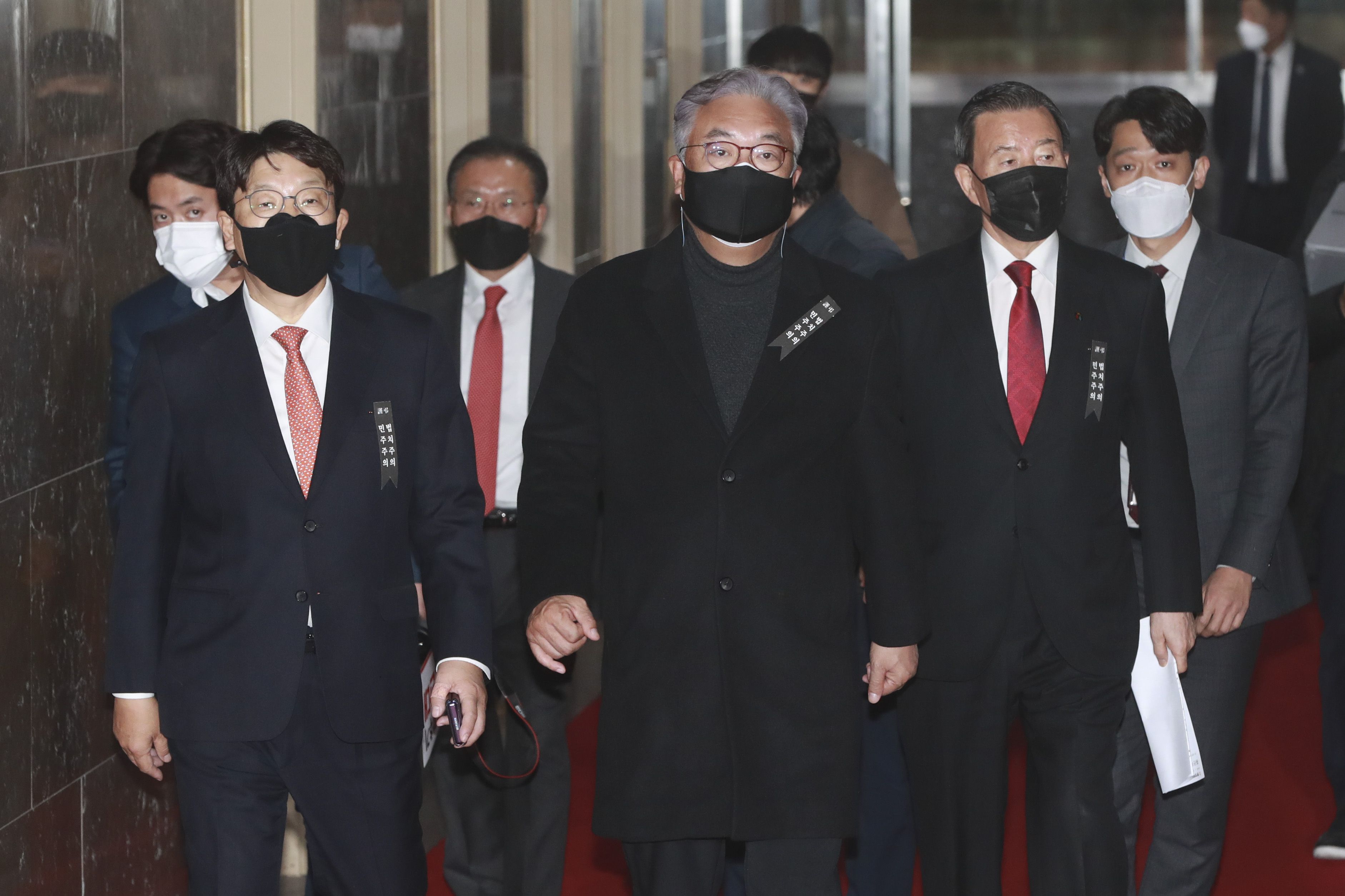 정진석 국민의힘 의원을 비롯한 중진 의원들이 9일 오후 서울 여의도 국회에서 본회의를 앞두고 의장실에 항의 방문하고 있다. 2020.12.09 이덕훈 기자 |