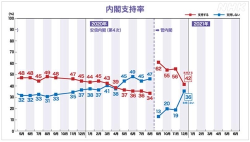 NHK는 지난 11~13일 전국 18세 남녀 1천249명을 대상으로 유·무선 전화 여론조사를 한 결과, 스가 내각 지지율은 지난달 조사 때보다 14%포인트 떨어진 42%로 나타났다고 14일 보도했다.