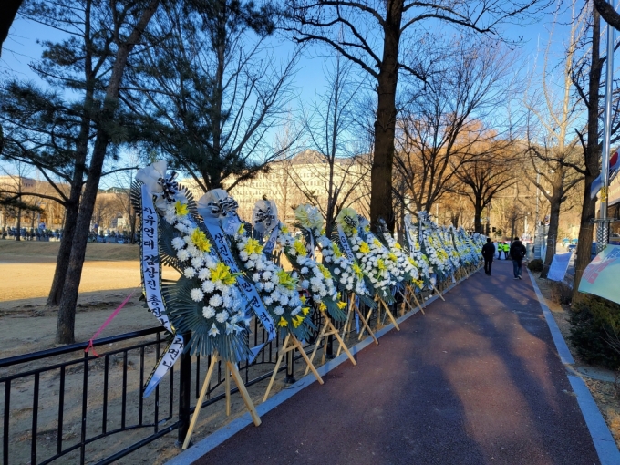 정부과천청사역 주변에 펼쳐진 '근조화환' 꽃길./사진=안채원 기자 |
