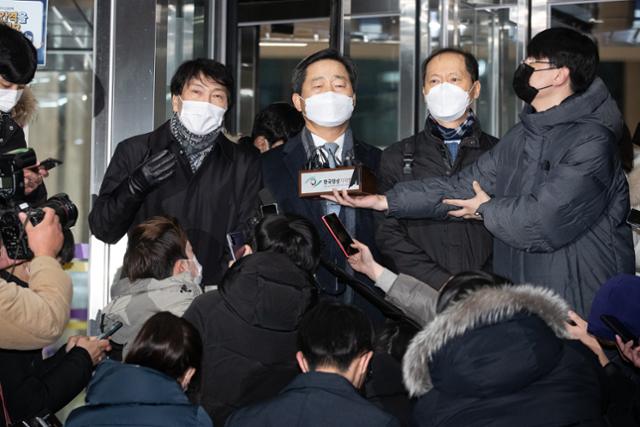 윤석열 검찰총장 측 특별변호인 손경식(왼쪽부터), 이석웅, 이완규 변호사가 15일 정부과천청사 법무부에서 열린 윤 총장에 대한 검사징계위원회 2차 심의를 마친 후 취재진 질문에 답하고 있다. 뉴시스 |