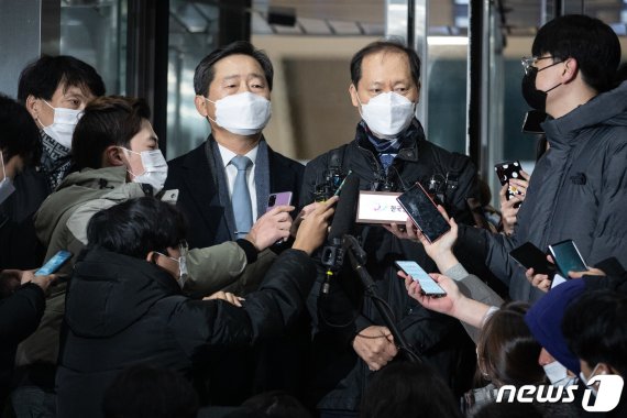 윤석열 검찰총장 측 특별변호인 이완규(오른쪽부터), 이석웅, 손경식 변호사가 지난 15일 정부과천청사 법무부에서 열린 윤 총장에 대한 검사징계위원회 2차 심의를 마친 후 취재진 질문에 답하고 있다. |