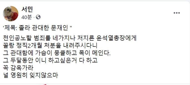 서 교수는 이날 페이스북에 “천인공노할 범죄를 네가지나 저지른 윤석열총장에게 꼴랑 정직2개월 처분을 내려주시다니 그 관대함에 가슴이 뭉클하고 목이 메인다”고 비꼬았다. 서 교수는 “그 두 달 동안 이니(지지자들이 문 대통령을 부르는 애칭) 하고 싶은 거 다 하고 꼭 감옥가라. 널 영원히 잊지않으마”라고 했다.
