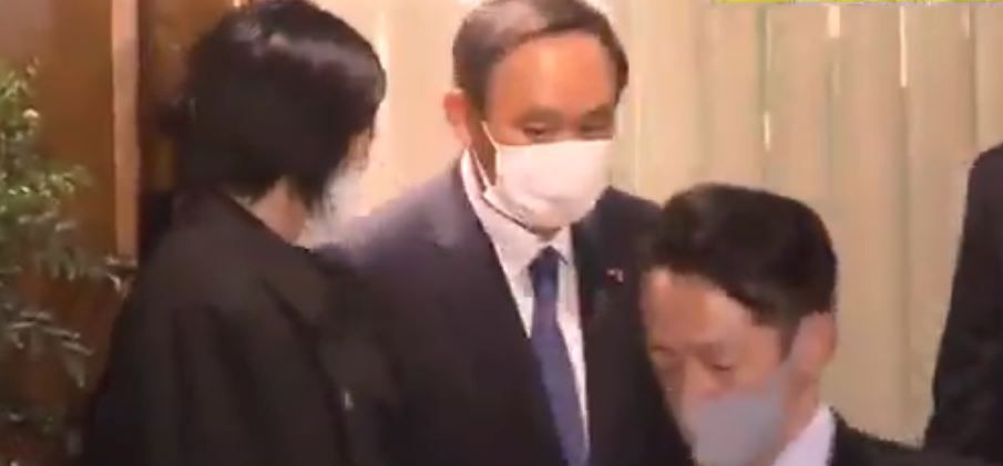 지난 14일 밤 도쿄 긴자 스테이크집에서 망년회를 한 스가 요시히데 일본 총리. /FNN 뉴스 캡처 |