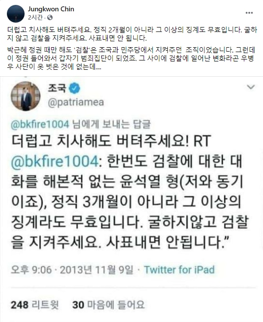 이는 지난 2013년 11월 9일 조 전 장관과 박범계 더불어민주당 의원이 트위터에 올린 내용을 똑같이 쓴 것이다. 당시 대검 감찰본부는 윤 총장이 국가정보원 대선 개입 수사와 관련해 상부에 적법한 보고를 하지 않았다는 이유로 법무부에 정직 3개월의 중징계를 청구했고, 법무부 검사징계위원회는 정직 1개월 처분을 했다.