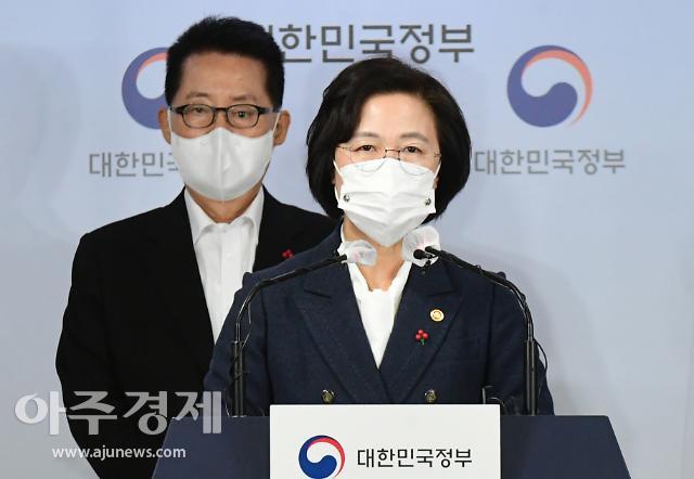 추미애(오른쪽) 법무부 장관과 박지원 국가정보원장이 16일 서울 종로구 정부서울청사 합동브리핑실에서 권력기관 개혁 관련 언론 브리핑을 하고 있다. |