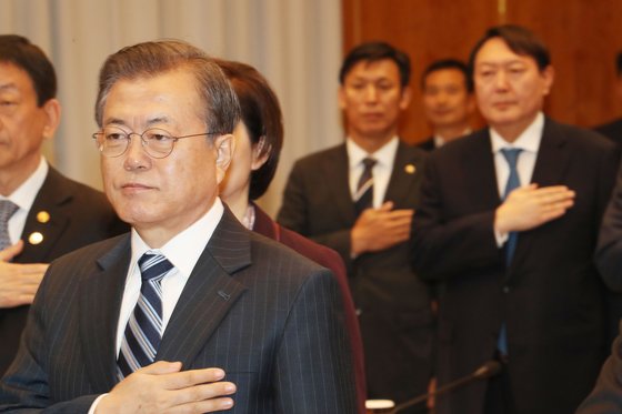 문재인 대통령과 윤석열 검찰총장이 지난해 11월 8일 오후 청와대에서 열린 반부패정책협의회에서 국민의례를 하고 있다. [청와대사진기자단] |