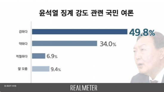 리얼미터가 tbs 의뢰로 지난 16일 여론조사를 실시한 결과 윤 총장에 대한 징계 강도가 ‘강하다’는 49.8%, ‘약하다’는 34.0%, ‘적절하다’는 6.9%로 집계됐다. ‘잘 모르겠다’는 9.4%였다.