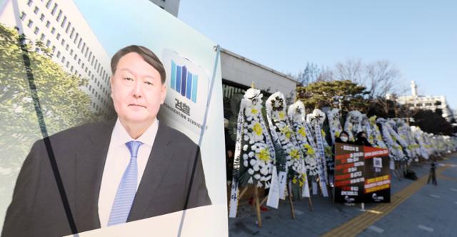 윤석열 검찰총장의 직무가 정지된 첫날인 17일 서울 서초구 대검찰청 앞에 추미애 법무부 장관을 규탄하는 근조화한이 줄지어 놓여있다. 뉴스1 |