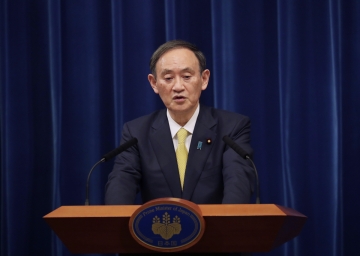 스가 요시히데 일본 총리가 4일 일본 도쿄에서 기자회견하고 있다. 도쿄/AP뉴시스 |