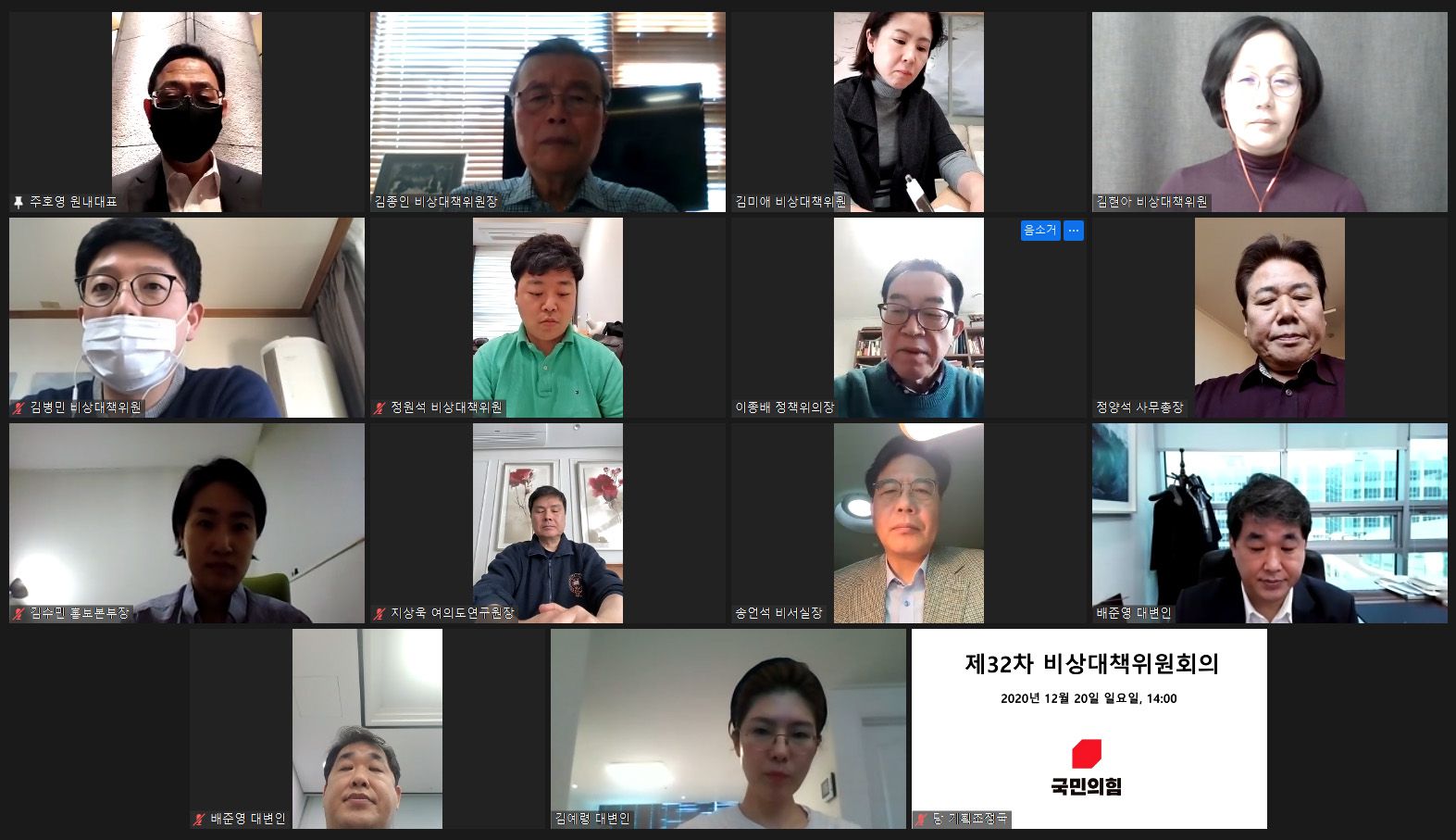 20일 오후 국민의힘 김종인 비상대책위원장, 주호영 원내대표와 의원들이 온라인으로 긴급 화상 비상대책위원회의를 하고 있다./국민의힘 |
