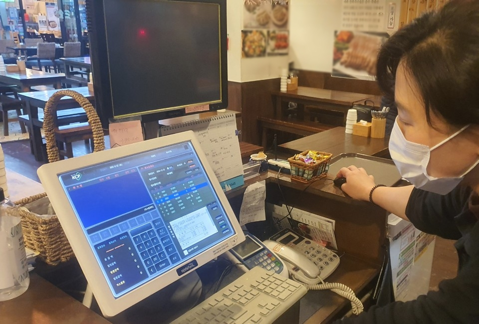 서울 영등포구 여의도동 한 오피스 상가에서 자영업자 김윤정(45)씨가 가게 매출을 살펴보고 있다. [사진=김빛나 기자] |