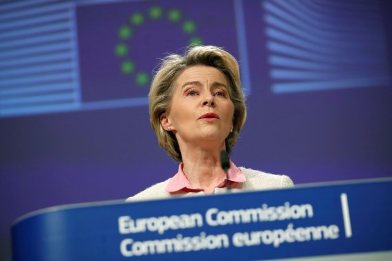 우르줄라 폰 데어 라이엔 유럽연합(EU) 집행위원장이 24일(현지시간) 벨기에 브뤼셀의 EU 본부에서 영국과 미래관계 협상 내용을 설명하고 있다.로이터뉴스1
