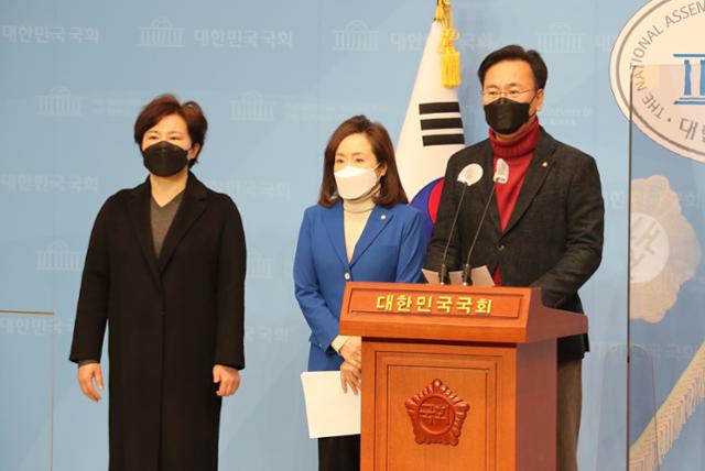 국회 법제사법위원회 소속 국민의힘 유상범(오른쪽부터), 전주혜, 조수진 의원이 25일 국회 소통관에서 윤석열 검찰총장의 사법부 판결에 대한 입장을 밝히고 있다. 연합뉴스 |