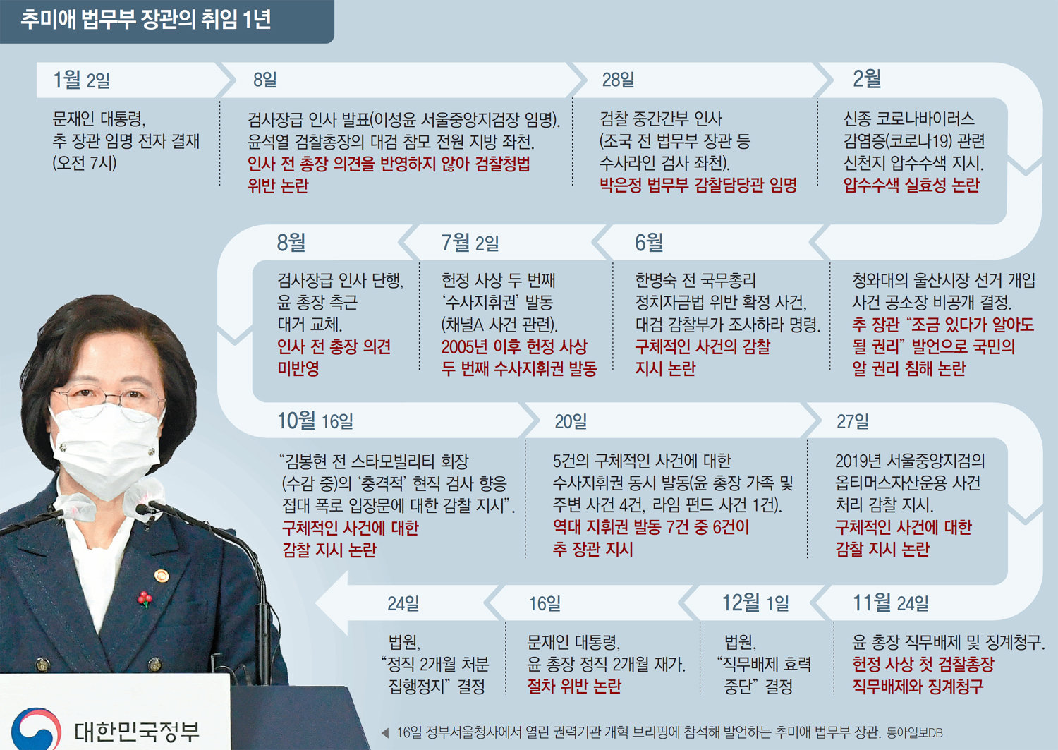 추 장관이 윤 총장과 대립과 반목을 거듭하며 강조했던 검찰의 직접수사 축소, 전관예우 철폐 등은 하나하나 풀어가야 할 사안이자 검찰개혁의 방향으로 여겨지기도 했다. 그러나 “최대한 자제하고 절제해 행사해야 한다는 원칙이 붕괴됐다”는 지적을 들을 정도로 추 장관이 수사지휘권을 여러 차례 발동하면서 법적 안정성을 떨어뜨린 것은 대표적 실책으로 지적된다. 올 7월 채널A 사건을 시작으로 라임자산운용 로비, 윤 총장 가족 및 측근 사건 5건에 대해 잇따라 지휘권이 발동됐다. 대부분 윤 총장 가족이나 측근을 겨냥한 수사에 수사지휘권이 발동되면서 “지휘권 발동이 가지는 의미와 무게감이 퇴색했다” “정치적 의도가 있는 지휘권과 감찰권 발동”이라는 평가가 나왔다.