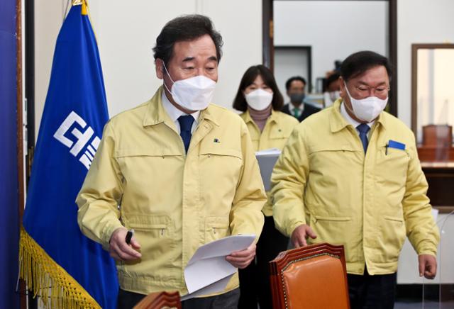 더불어민주당 이낙연 대표와 김태년 원내대표가 28일 국회에서 열린 최고위원회의에 참석하고 있다. 오대근 기자 |