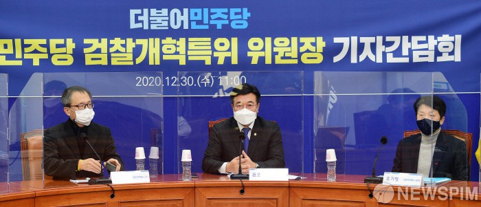 [서울=뉴스핌] 최상수 기자 = 윤호중 더불어민주당 검찰개혁특위 위원장이 30일 국회에서 검찰개혁특위 운영방향 및 향후계획에 대해 기자간담회를 갖고 있다. 2020.12.30 kilroy023@newspim.com
