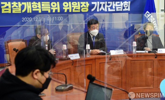 [서울=뉴스핌] 최상수 기자 = 윤호중 더불어민주당 검찰개혁특위 위원장이 30일 국회에서 검찰개혁특위 운영방향 및 향후계획에 대해 기자간담회를 갖고 있다. 2020.12.30 kilroy023@newspim.com