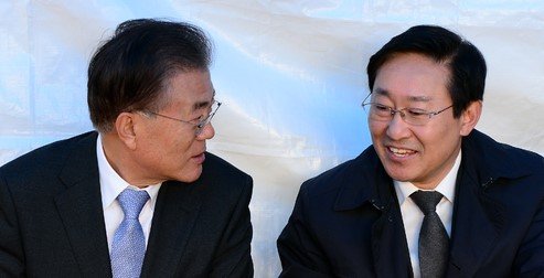 '국정농단' 사태 당시 박근혜 대통령 퇴진운동을 선언한 문재인 더불어민주당 대표가 박범계 의원과 이야기를 나누고 있다. [뉴시스] |