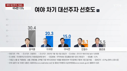 3일 여론조사기관 리얼미터가 YTN 의뢰로 지난 1일부터 2일까지 양일간 실시한 조사결과 윤석열 총장이 30.4%의 지지율로 1위에 올랐다. 같은 조사에서 이재명 지사는 20.3%, 이낙연 대표는 15%로 집계됐다. 윤석열 총장이 오차범위 밖에서 1위를 기록하고 지지율 30%를 넘어선 것은 이번이 처음이다.