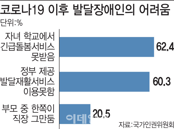 국가인권위원회가 지난달 발달장애인 부모 1174명을 대상으로 실시한 ‘코로나19 상황에서 발달장애인과 가족의 삶’ 설문조사에 따르면 코로나19로 인한 기관 휴관으로 발달재활서비스를 이용하지 못했다는 응답자가62.4%에 달했다. 거주지에서 가장 근접한 복지시설인 장애인복지관도 95% 이상 휴관해 대부분 이용하지 못한 것으로 나타났다.